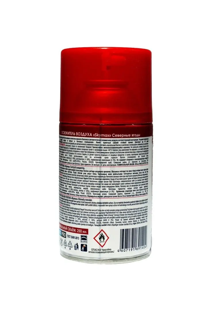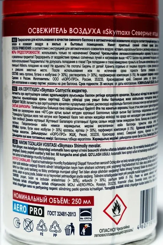 Аэрозоли Sky - это серия освежителей воздуха, созданных на основе натуральных компонентов, которые легко устраняют неприятные запахи, оставляя свой тонкий и нежный аромат (подходит для Glade, Airwick). Состав: деионизованная вода (30% и более), пропан/бутан/ изобутан (30% и более), парфюмерная композиция (5% и менее), сорбитан олеат (5% и менее), натрия нитрит (5% и менее)