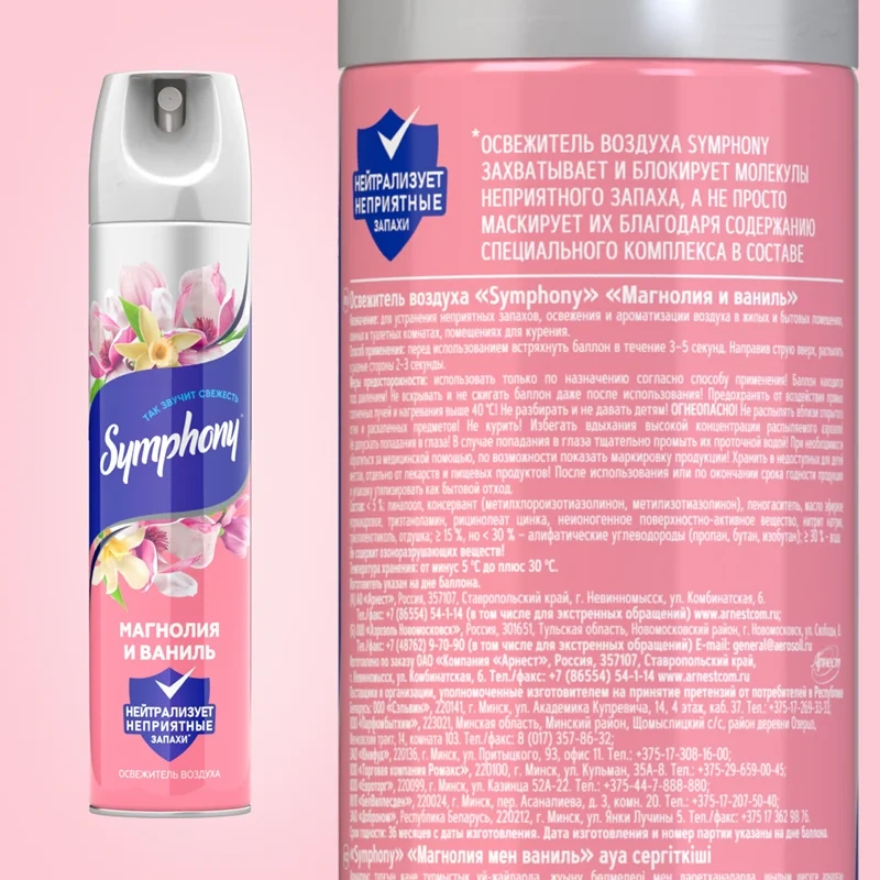 Активные вещества, в составе средства, захватывают и нейтрализуют неприятные запахи, а эфирные масла раскрывают аккорды парфюмерного аромата. Превосходное распыление, без брызг и капель, не оставит пятен и потеков на кафеле, зеркале, текстиле, волосах и одежде. Аэрозольный распылитель Symphony идеально подойдет для кухни, гостиной, туалета, унитаза и ванной комнаты, нейтрализуя даже стойкие запахи, обеспечивая долгое ощущение чистоты.