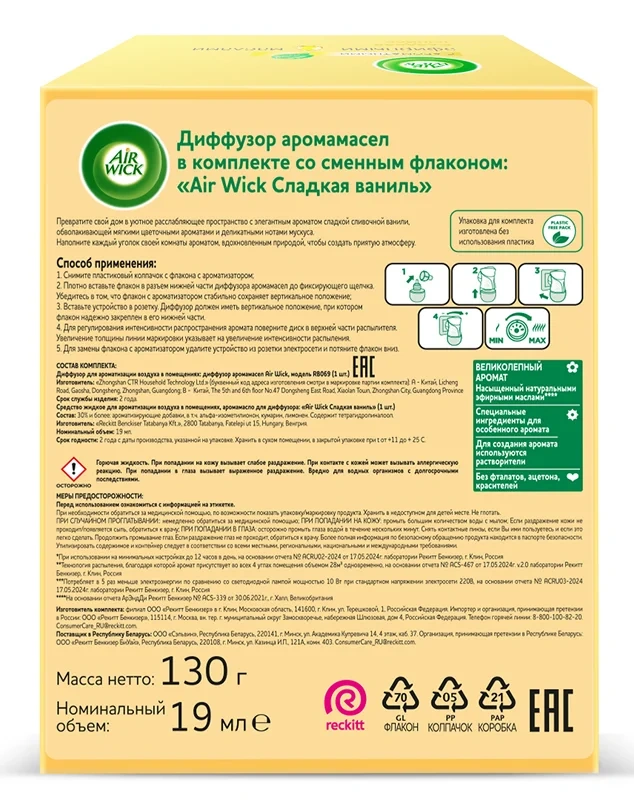 Диффузор аромамасел AirWick в комплекте с аромамаслом для диффузора Сладкая ваниль, 19мл