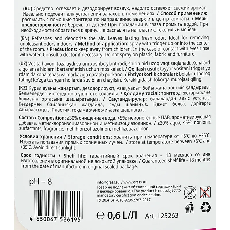 Освежитель воздуха Grass А5+ 600мл, спрей, 125263