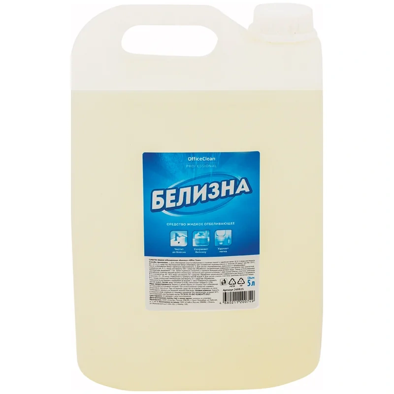 Средство жидкое отбеливающее. Предназначено для отбеливания и удаления пятен с белых изделий из хлопчатобумажных и льняных тканей, для мытья эмалированных, фарфоровых, фаянсовых поверхностей, облицовочной плитки, пластика, для обработки унитазов, мусорных ведер. После обработки раствором изделие прополоскать, поверхность промыть водой. Состав: вода питьевая(?30%), гипохлорит натрия (5-15%).