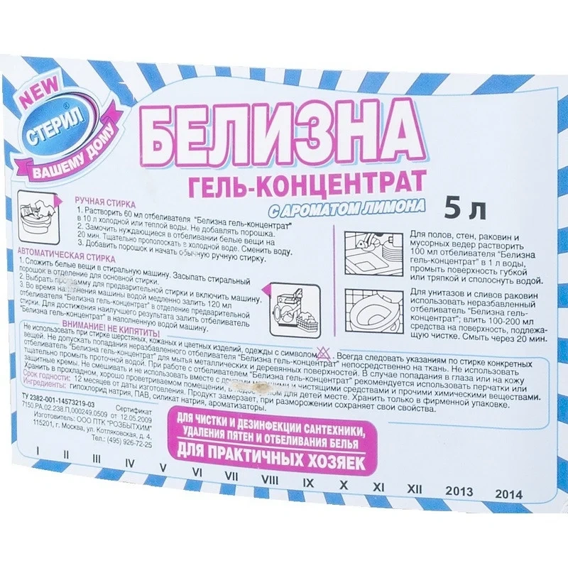 Отбеливатель Белизна Стерил Лимон гель 5 л (содержание хлора 15-30%) Назначение: предназначен для отбеливания и удаления пятен с белых изделий из хлопчатобумажных тканей, для мытья и гигиенической обработки эмалированно, фарфоровой, фаянсовой посуды, облицовочной плитки, пластика, унитазов, мусорных ведер, для мытья и гигиенической обработки, бетонированных и цементных поверхностей в аэропортах, вокзалах, бассейнах и банях. Способ применения: Отбеливатель при ручной стирке: Растворить 60 мл отбеливателя в 10 л холодной или теплой воды. Не добавлять порошка. Замочить белые вещи на 20 минут. Тщательно прополоскать в холодной воде. Сменить воду. Добавить порошок и начать обычную стирку. Отбеливатель при стирке в стиральной машине: Сложить белые вещи в стиральную машину. Засыпать стиральный порошок в отделение для основной стирки. Выбрать программу для предварительной стирки и включить машину. Во время наполнения машины водой медленно залить 3/4 части стакана (120 мл) отбеливателя в отделение предварительной стирки. Дезинфицирующие средство. Для унитазов и сливов раковин использовать неразбавленный отбеливатель: влить 1 стакан (200 мл) в унитаз (раковину) и смыть через 20 минут. Для полов, стен, раковин, мусорных ведер растворить 100мл отбеливателя в 1 л воды. промыть поверхность губкой. Меры предосторожности: внимание! Не кипятить. Всегда следовать указаниям по стирке конкретных вещей. Не допускать попадания отбеливателя на ткань. При попадании в глаза и на кожу - немедленно промыть большим количеством воды! При необходимости обратиться к врачу. Работать в резиновых перчатках! Состав: вода, гипохлорит натрия более 15%, но менее 30%, силикат натрия менее 5%, ароматизаторы. Условия хранения: хранить в местах. недоступных для детей! Хранить в прохладном, хорошо проветриваемом помещении в недоступном для детей месте. Срок годности: 12 месяцев от даты изготовления.