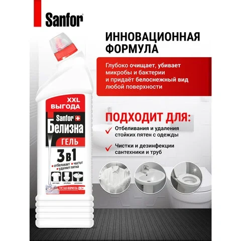 Средство для отбеливания и чистки тканей 1,5 л, SANFOR 'Белизна' 3 в 1 гель, 25408
