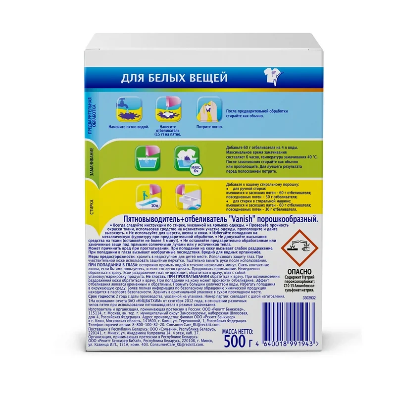 Пятновыводитель и отбеливатель Vanish порошкообразный, 500г