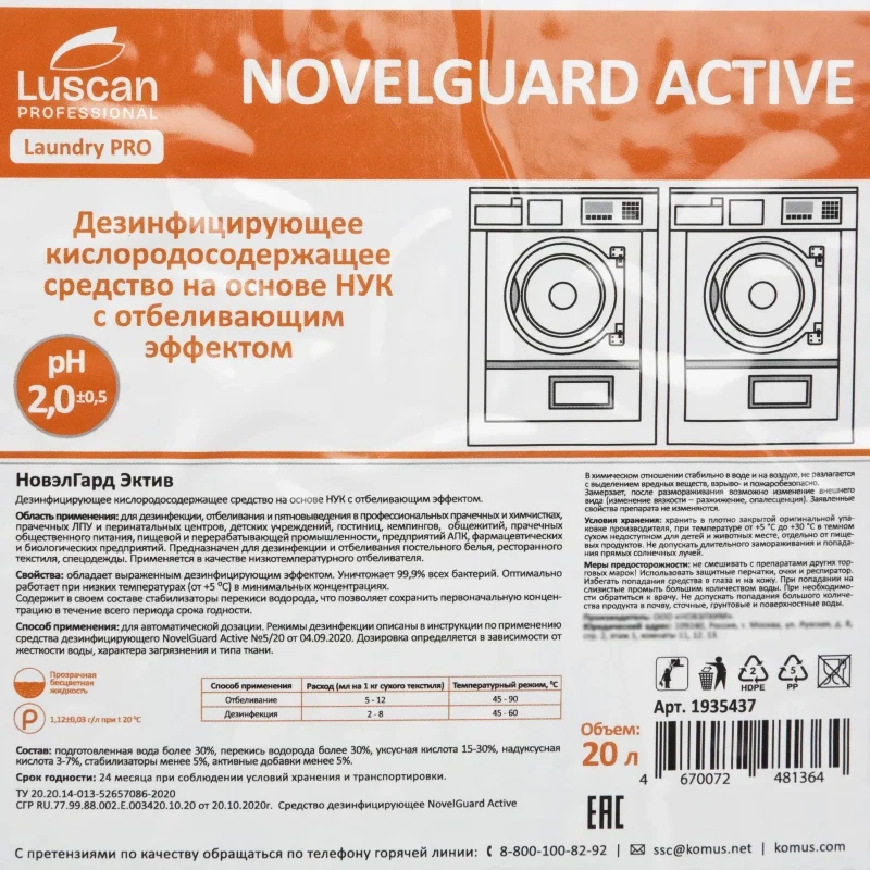Отбеливатель для белья Luscan Professional NovelGuard Active 20л, дезинфицирующее