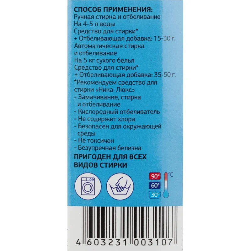 Состав: натрия перкарбонат. Способ применения: загружать одновременно со средством Ника-Люкс 0,5 ч.л на 5 ст.л. средства.