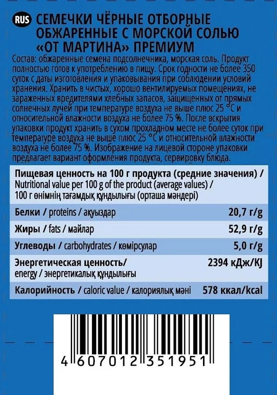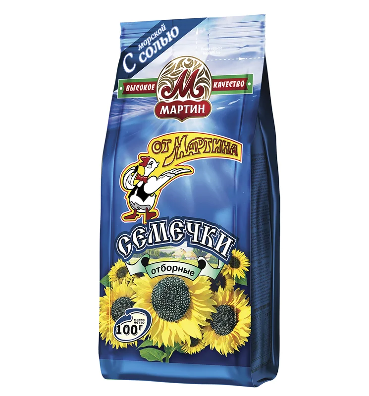 Отборные Premium От Мартина с морской солью 100г – вкусный и питательный продукт для взрослых и детей, который скрасит ваш досуг. Благодаря компактной и практичной упаковке его можно брать с собой, например, на работу или в дальнюю поездку. Для его приготовления используются отборные семечки подсолнуха, которые достаточно легко перевариваются и усваиваются. В их белках содержится множество незаменимых аминокислот, способных обеспечить нормальный обмен веществ. Магний, калий и фосфор, также содержащийся в составе семечек подсолнуха, обеспечивают стабильную работу сердечно-сосудистой системы, предупреждая развитие атеросклероза и инфаркта миокарда. Они являются и кладезю витаминов, среди которых есть такие, как A, B, E, D. Каждый из них оказывает определенное полезное воздействие на организм, например, витамины A и D нужны для зрения и роста костей соответственно. Хранить продукт следует в чистом, хорошо вентилируемом помещении, не подвергая воздействию прямых солнечных лучей. Мартин – компания родом из Московской области, которая была основана в 2000 году. Упорная работа, направленная на улучшение селекции и технологии обжарки, принесли хорошие результаты. Сегодня компания поставляет на рынок отборные семечки, которые приобрели известность не только в РФ, но и в некоторых других странах. Большую роль в достижении необходимых итогов играет выбор сорта подсолнечника и места его выращивания, чему придается особое значение. Оборудование, используемое на предприятии, регулярно обновляется и совершенствуется. В качестве сырья используются экологичные компоненты. Продукция компании была неоднократно отмечена различными наградами, в том числе и на международных выставках (например, на ArmProd Expo и Продэкспо).