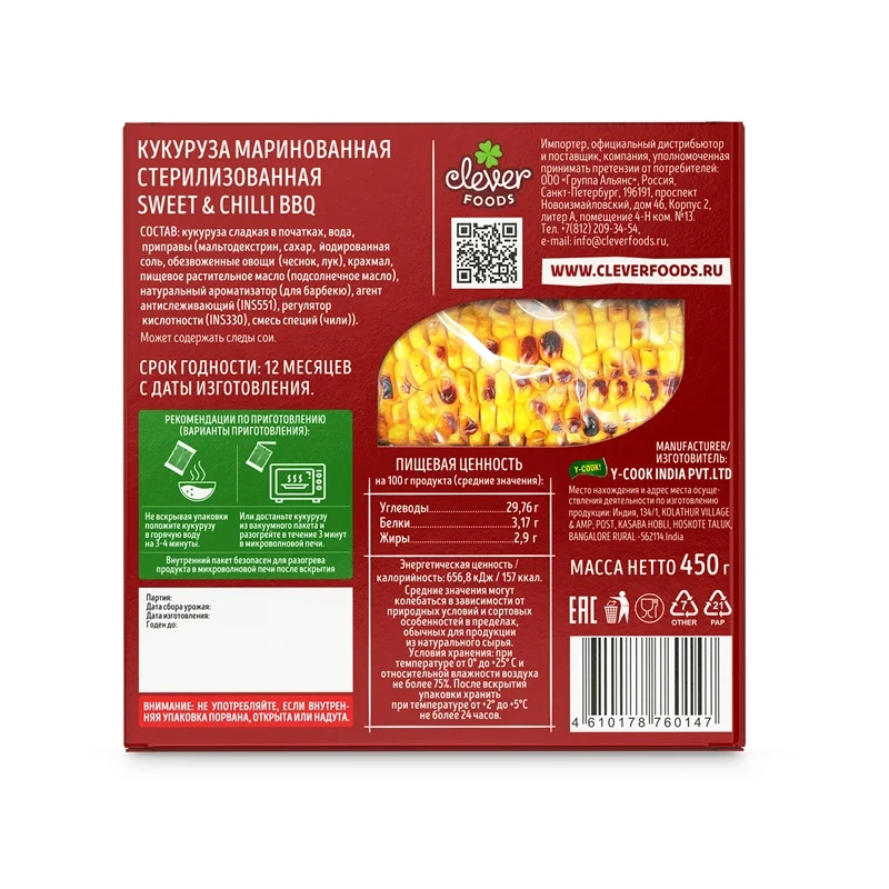 Кукуруза маринованная Sweet&Chili BBQ, 450г