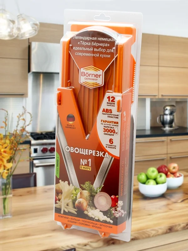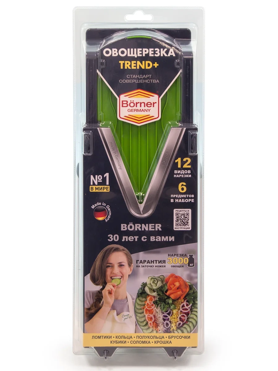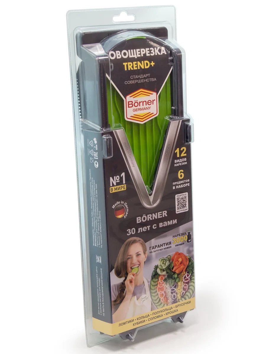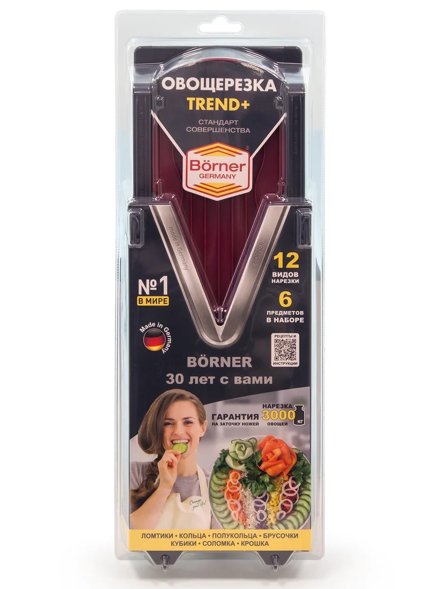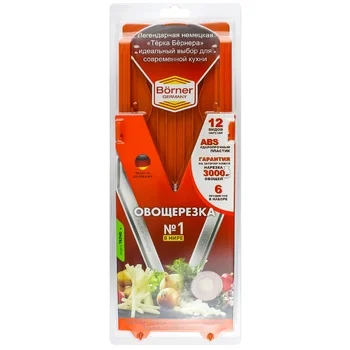 Овощерезка Borner Trend plus станет незаменимым помощником на кухне. Комплект овощерезки состоит из 6-ти предметов: рамы V (в которую вставляются вставки), безопасного плододержателя, безножевой вставки (для шинковки капусты, нарезки из любых продуктов колечек, пластов и ломтиков), вставка с ножами 3,5 мм (для нарезки длинной или короткой соломки, мелких кубиков), вставки с ножами 7 мм (для нарезки длинных или коротких брусочков, крупных кубиков), мультибокса для хранения. Овощерезка легко моется, продукты к ней не прилипают. Достаточно просто сполоснуть изделие под струей теплой воды. Корпус выполнен из прочного ABS-пластика. Этот материал отличается ударопрочностью и в то же время легкостью. Ножи-микросеррейторы из нержавеющей стали остро заточены. Овощерезка обеспечивает 12 видов нарезки. Вставки фиксируются защелкиванием в основной раме.