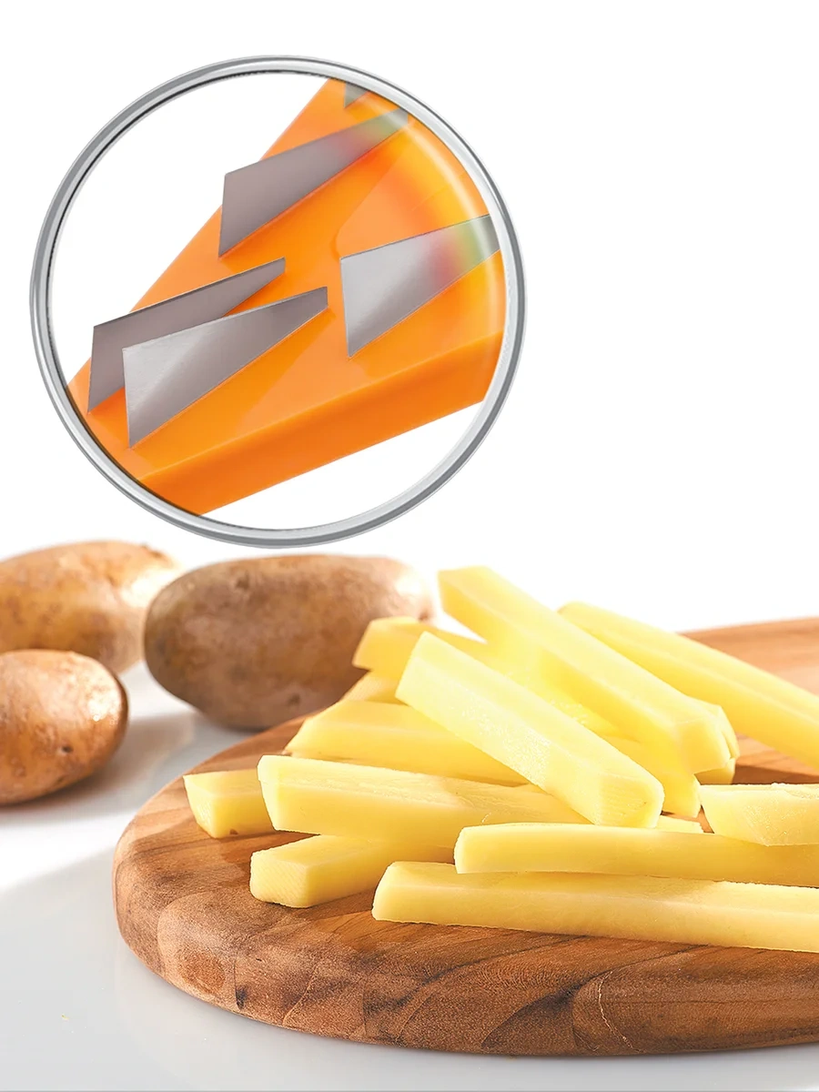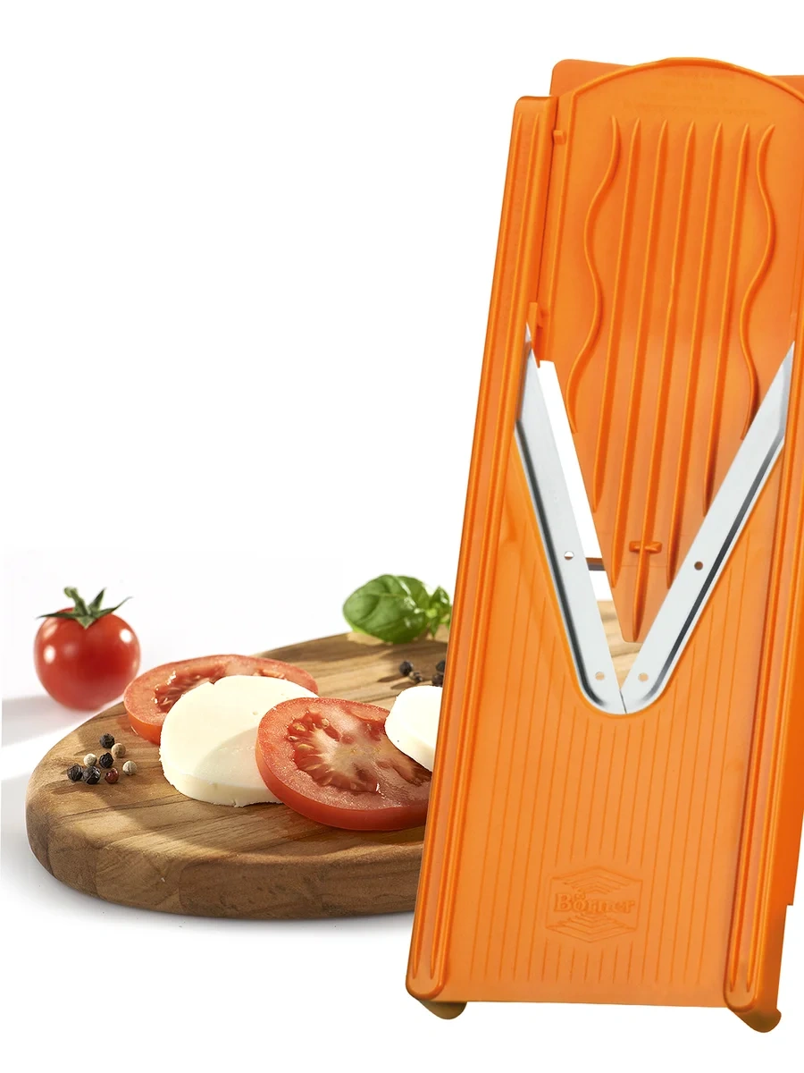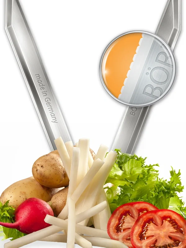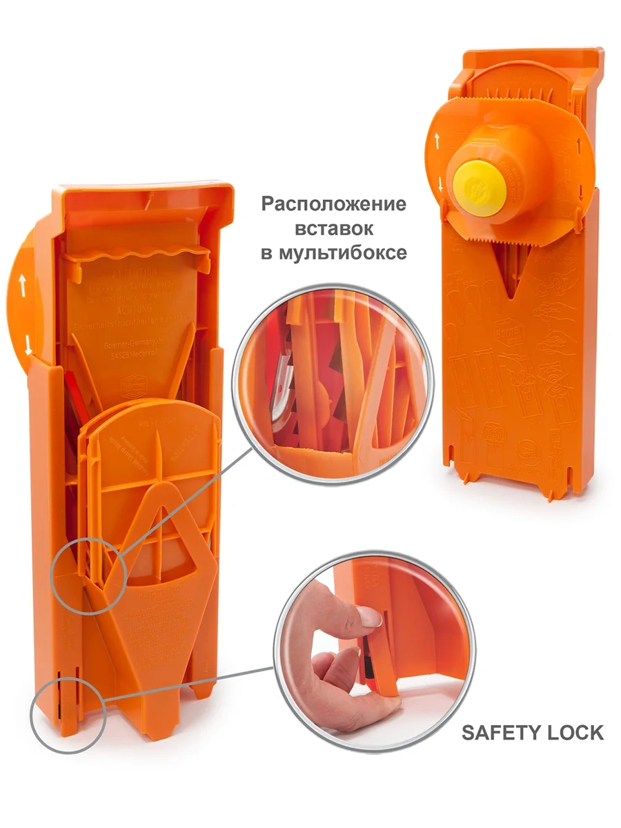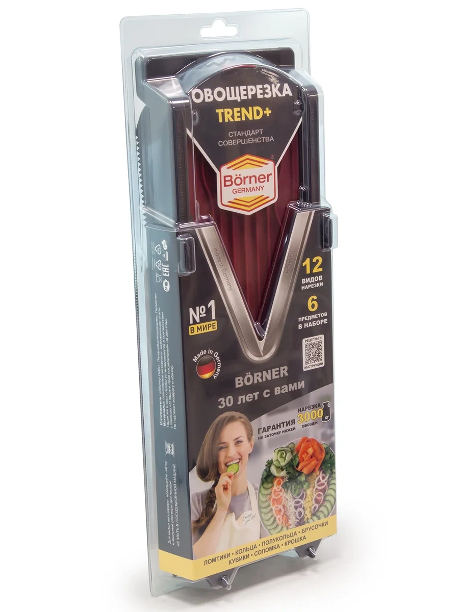 Овощерезка Borner Trend plus станет незаменимым помощником на кухне. Комплект овощерезки состоит из 6-ти предметов: рамы V (в которую вставляются вставки), безопасного плододержателя, безножевой вставки (для шинковки капусты, нарезки из любых продуктов колечек, пластов и ломтиков), вставка с ножами 3,5 мм (для нарезки длинной или короткой соломки, мелких кубиков), вставки с ножами 7 мм (для нарезки длинных или коротких брусочков, крупных кубиков), мультибокса для хранения. Овощерезка легко моется, продукты к ней не прилипают. Достаточно просто сполоснуть изделие под струей теплой воды. Корпус выполнен из прочного ABS-пластика. Этот материал отличается ударопрочностью и в то же время легкостью. Ножи-микросеррейторы из нержавеющей стали остро заточены. Овощерезка обеспечивает 12 видов нарезки. Вставки фиксируются защелкиванием в основной раме.