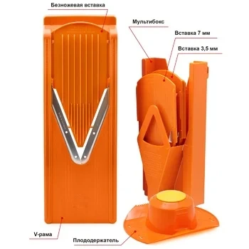 | Комплектация | v-рама - 1 шт.; безопасный плододержатель - 1 шт.; безножевая вставка (для шинковки капусты, нарезки |