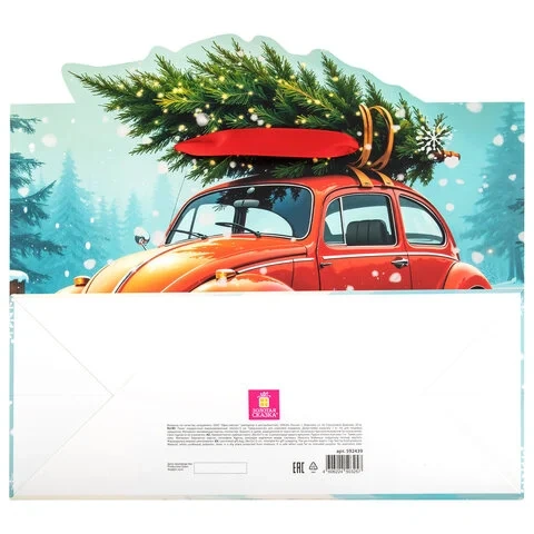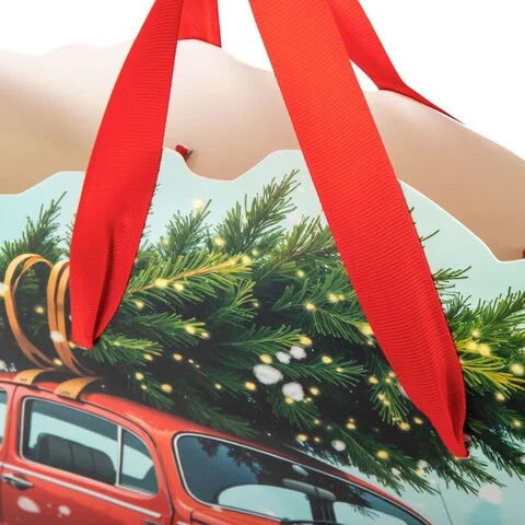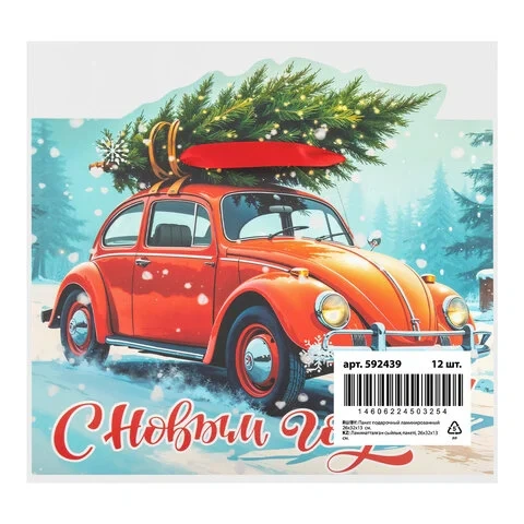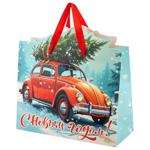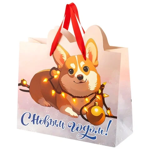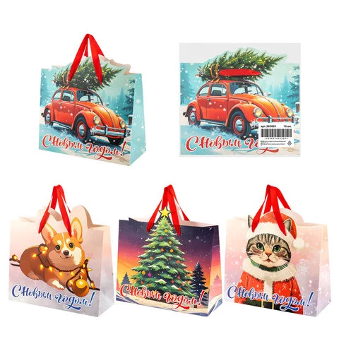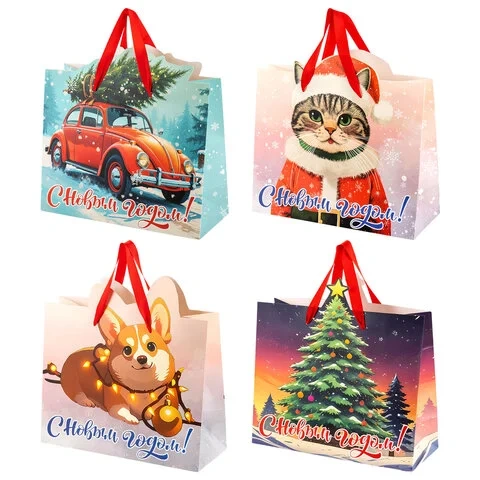 Подарочный новогодний пакет изготовлен из ламинированного мелованного картона, снабжен ленточными ручками из полиэстера. Размер – 26х13х32 см. На пакетах изображены иллюстрации в новогодней тематике и поздравительные надписи (4 дизайна ассорти без возможности выбора), которые точно вызовут улыбку. К некоторым деталям иллюстрации добавлен 3D-эффект.