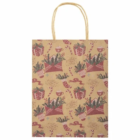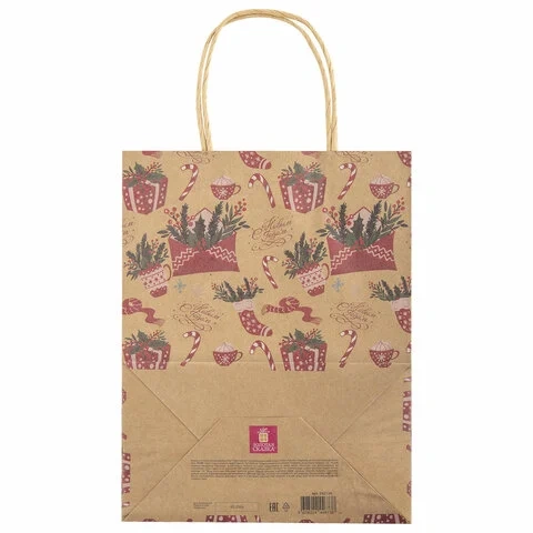 Подарочный пакет новогодний изготовлен из крафт-бумаги, имеет бумажные ручки. Размер – 18x10x23 см. Пакет выполнен с изображением новогодних атрибутов.