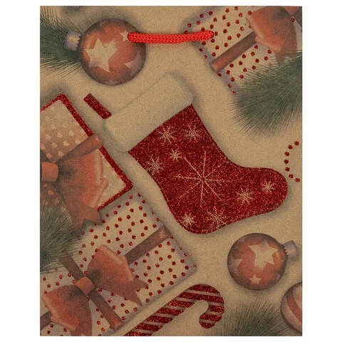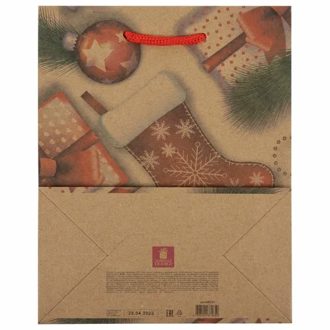 Изготовлен из крафтовой бумаги с веревочными ручками из полипропилена. Размер – 18x10x23 см. Пакет выполнен в красном цвете с изображением праздничных новогодних атрибутов. С лицевой стороны пакета некоторые детали выделены глиттером.