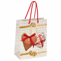 Изготовлен из ламинированной мелованной бумаги с веревочными ручками из полипропилена. Размер 17,8x9,8x22,9 см. Пакет выполнен в белых и красных тонах с изображением двух сердец.