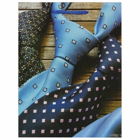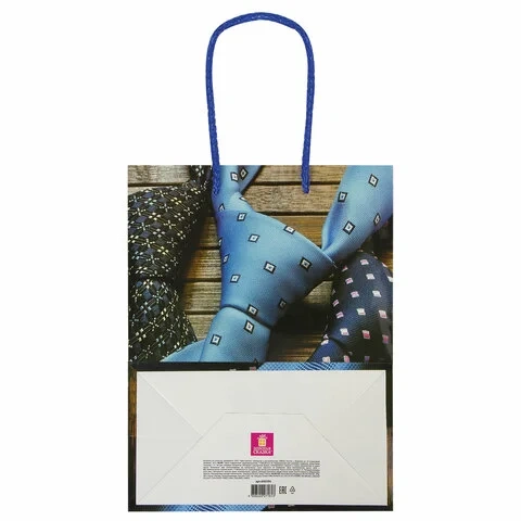 Изготовлен из ламинированной мелованной бумаги с веревочными ручками из полипропилена. Размер 17,8x9,8x22,9 см. Пакет выполнен в коричневых, синих и голубых тонах с изображением галстуков.