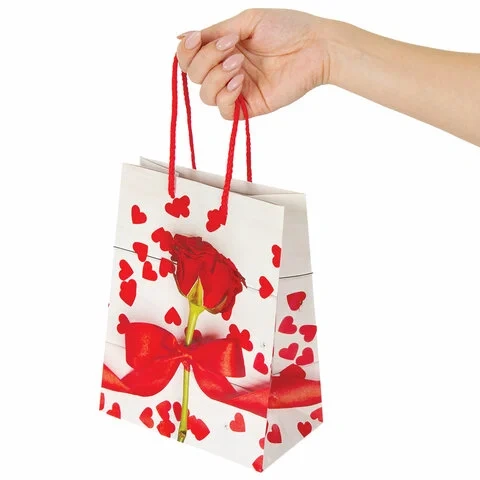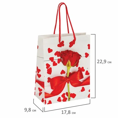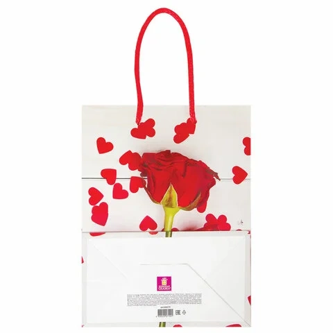 Изготовлен из ламинированной мелованной бумаги с веревочными ручками из полипропилена. Размер 17,8x9,8x22,9 см. Пакет выполнен в белых и красных тонах с изображением красной розы, украшенной лентой.