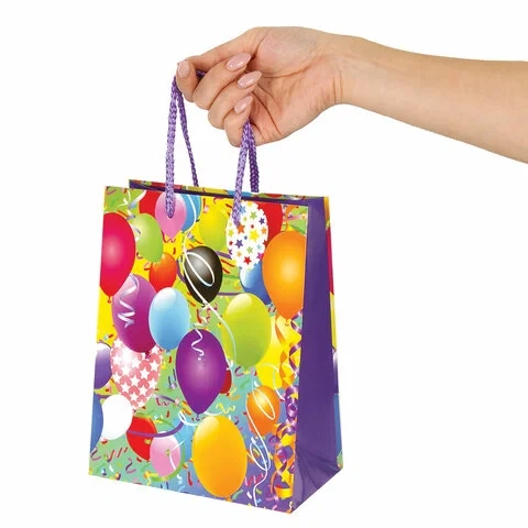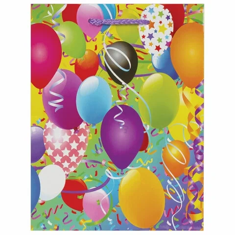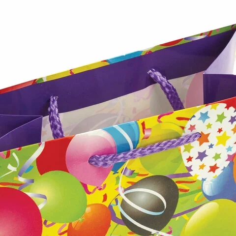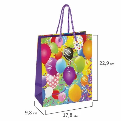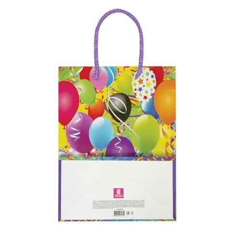 Изготовлен из ламинированной мелованной бумаги с веревочными ручками из полипропилена. Размер 17,8x9,8x22,9 см. Пакет выполнен в ярких фиолетовых, голубых и желтых тонах с изображением воздушных шаров.