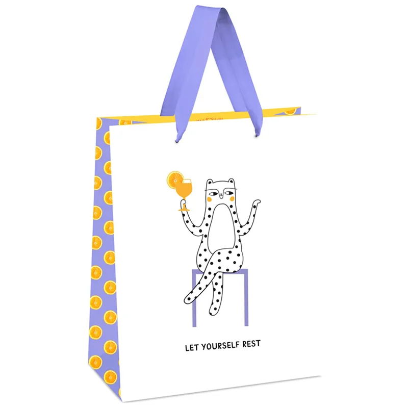 Пакеты MESHU – беспроигрышный способ преподнести подарок красиво. Размер подарочного пакета – 18*23*10 см. Изготовлен из белой крафт-бумаги с выборочным лакированием. Пакет MESHU Lets yourself rest выполнен в забавном оригинальном дизайне.