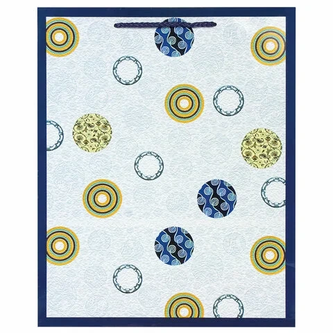 Изготовлен из ламинированной мелованной бумаги с веревочными ручками из полипропилена. Размер 26x12,7x32,4 см. Пакет с принтом в виде кругов и колец выполнен в серых, синих и бежевых тонах.