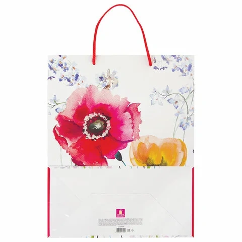 Изготовлен из ламинированной мелованной бумаги с веревочными ручками из полипропилена. Размер 26x12,7x32,4 см. Пакет выполнен в бело-красных тонах с изображением красных и желтых маков, выполненных акварельной техникой.