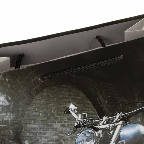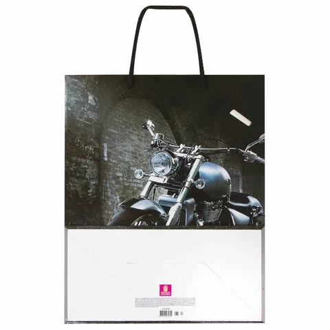 Изготовлен из ламинированной мелованной бумаги с веревочными ручками из полипропилена. Размер 26x12,7x32,4 см. Пакет выполнен в серых тонах с изображением мотоцикла.