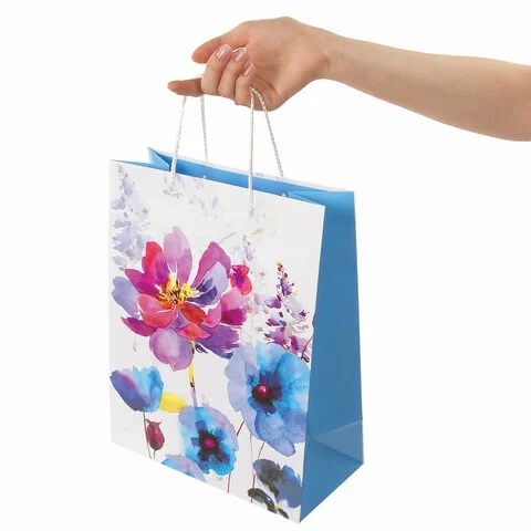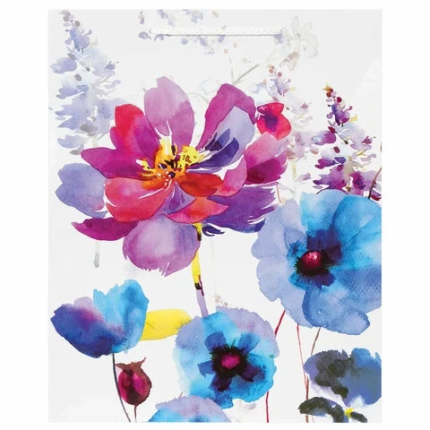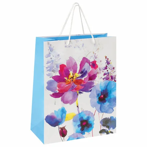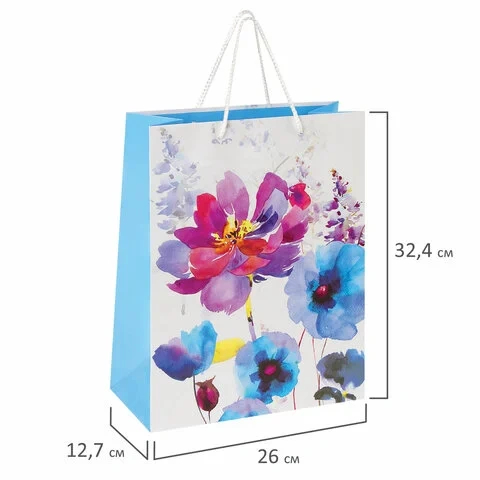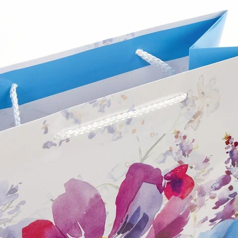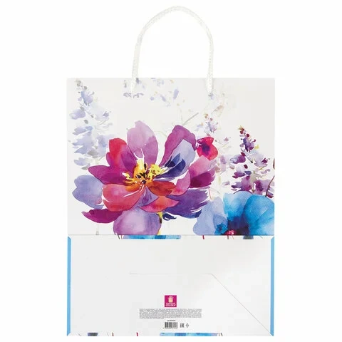 Изготовлен из ламинированной мелованной бумаги с веревочными ручками из полипропилена. Размер 26x12,7x32,4 см. Пакет выполнен в белых, голубых и сиреневых тонах с изображением весенних цветов, выполненных акварельной техникой.