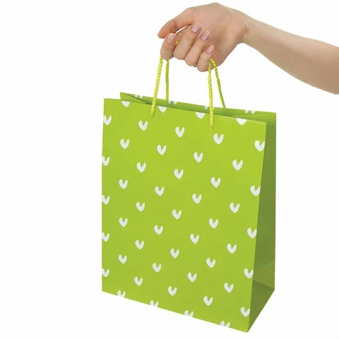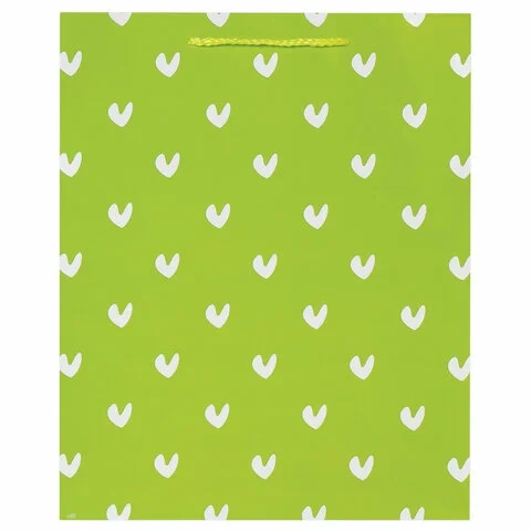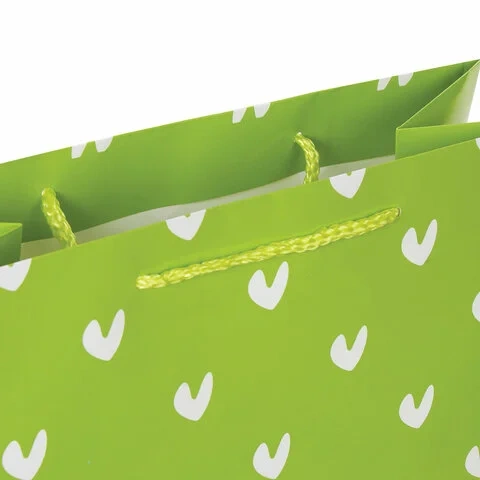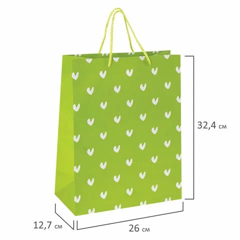 Изготовлен из ламинированной мелованной бумаги с веревочными ручками из полипропилена. Размер 26x12,7x32,4 см. Пакет с принтом в виде галочек-сердечек выполнен в зеленом цвете.