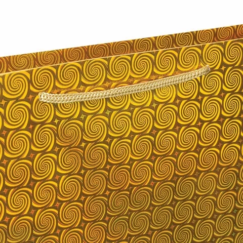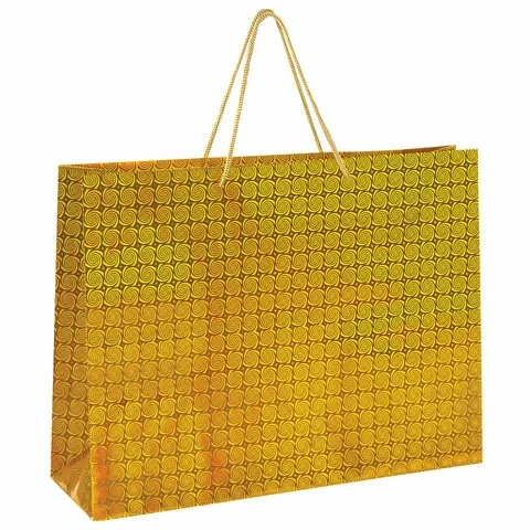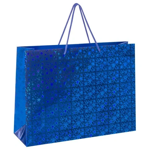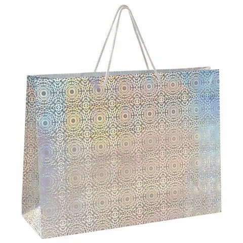 Голографический пакет изготовлен из мелованной бумаги с веревочными ручками из полипропилена и представлен в трех цветах и дизайнах. Выполнен в синем, серебристом и золотистом цветах. Размер 44,7x12,7x33 см.