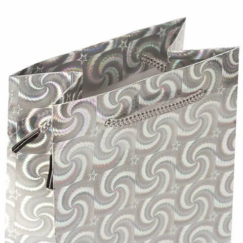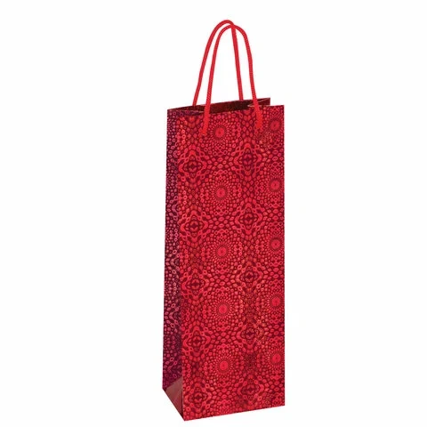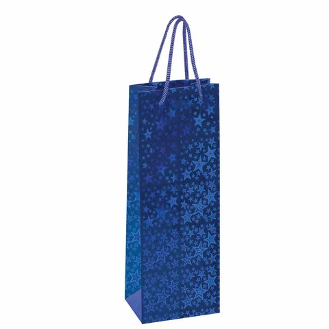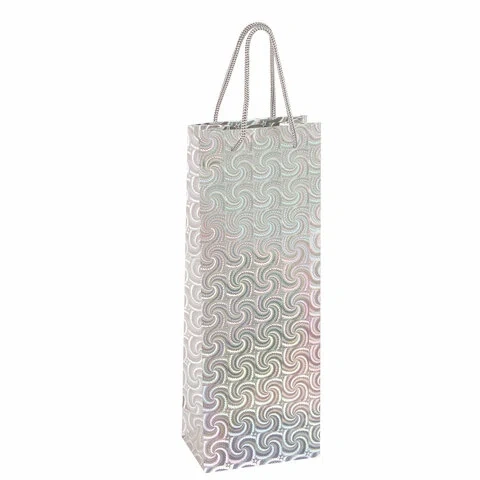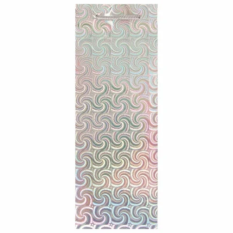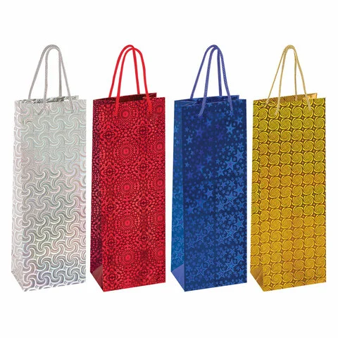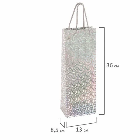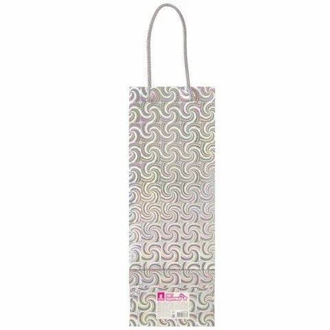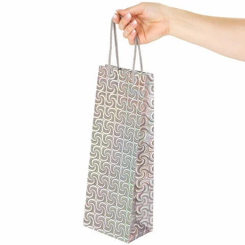 Бутылочный голографический пакет изготовлен из мелованной бумаги с веревочными ручками из полипропилена и представлен в четырех цветах и дизайнах. Выполнен в красном, синем, серебристом и золотистом цветах. Размер – 13x8,5x36 см.