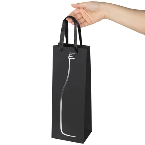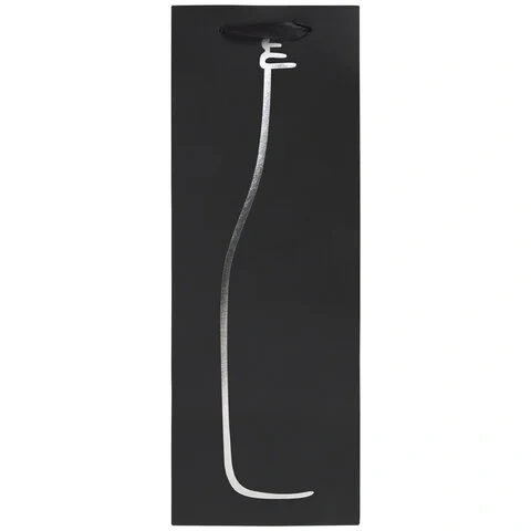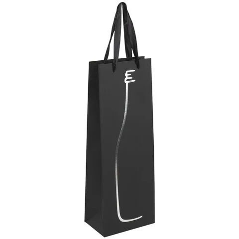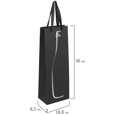 Изготовлен из крафтовой бумаги с ленточными ручками из полиэстера. Размер - 13x8,5x36 см. Пакет выполнен в чёрном цвете с изображением силуэта бутылки. С лицевой стороны пакета некоторые детали покрыты тиснением серебристой фольгой.