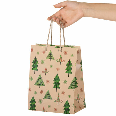 Изготовлен из ламинированной мелованной бумаги с веревочными ручками из полипропилена. Размер - 17,8x9,8x22,9 см. Дизайн пакета выполнен в бежевых тонах с рисунком в виде новогодних ёлочек.