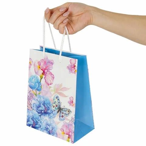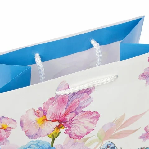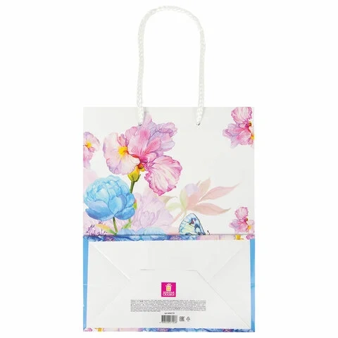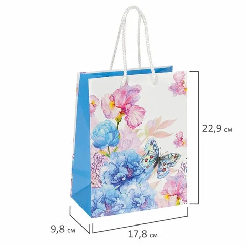 Изготовлен из ламинированной мелованной бумаги с веревочными ручками из полипропилена. Размер 17,8x9,8x22,9 см. Пакет выполнен в белых и голубых тонах с изображением бабочки и цветов.