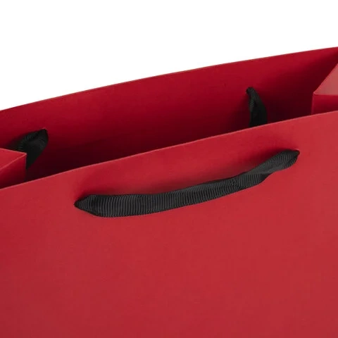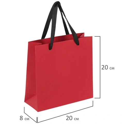 Изготовлен из крафтовой бумаги с ленточными ручками из полиэстера и представлен в трех цветах. Пакет выполнен в однотонном красном, синем, черном цветах. Размер – 20х20х8 см.