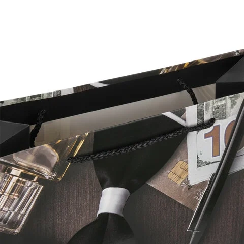 Изготовлен из ламинированного мелованного картона с веревочными ручками из полипропилена. Размер - 26,5x12,7x33 см. Пакет выполнен в мужском стиле в чёрном цвете. С лицевой стороны пакета некоторые детали покрыты выборочным лаком.