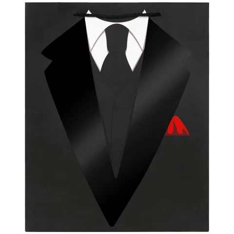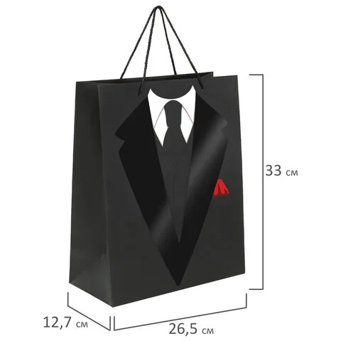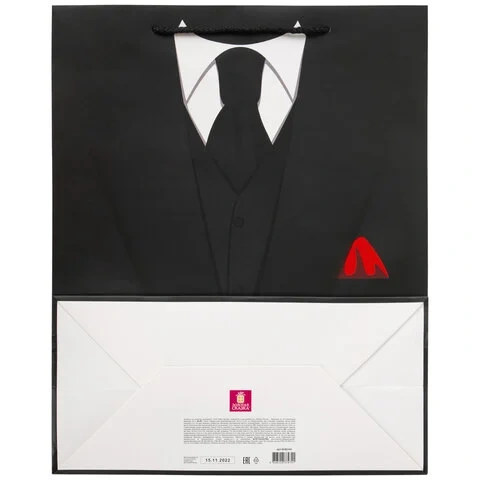 Изготовлен из ламинированного мелованного картона с веревочными ручками из полипропилена. Размер - 26,5x12,7x33 см. Пакет выполнен в мужском стиле в чёрном цвете. С лицевой стороны пакета некоторые детали покрыты выборочным лаком.