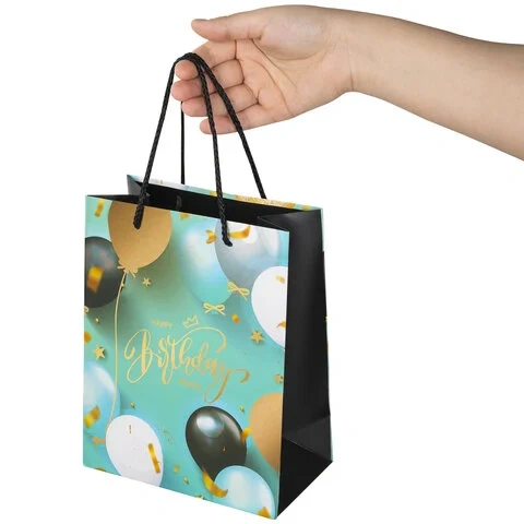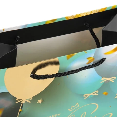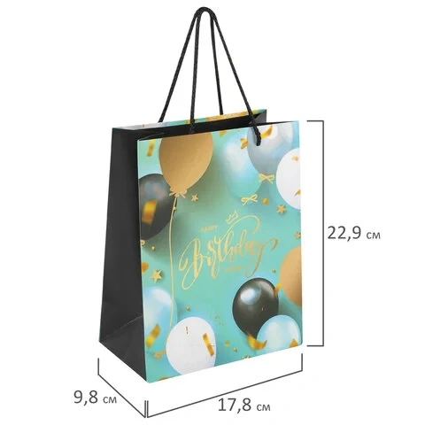 Изготовлен из ламинированного мелованного картона с веревочными ручками из полипропилена. Размер - 17,8x9,8x22,9 см. Пакет выполнен в бирюзовых тонах с изображением ярких праздничных воздушных шаров. С лицевой стороны пакета некоторые детали покрыты тиснением золотистой фольгой.
