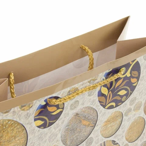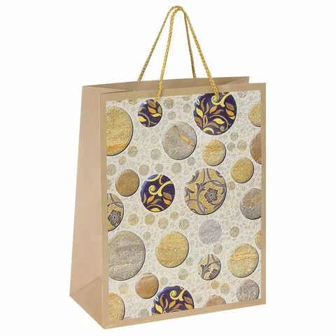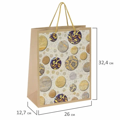Изготовлен из ламинированной мелованной бумаги с веревочными ручками из полипропилена. Размер 26x12,7x32,4 см. Пакет с абстрактным орнаментом выполнен в серых, бежевых и синих тонах.