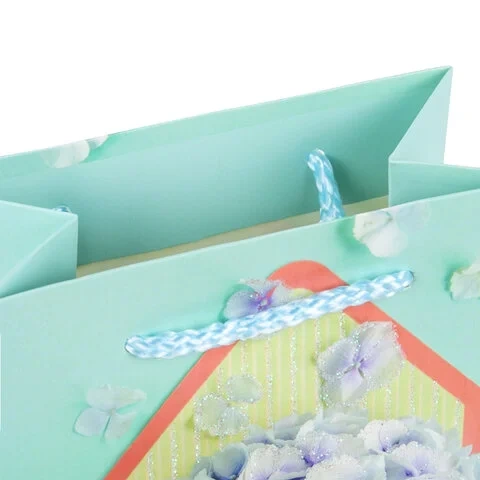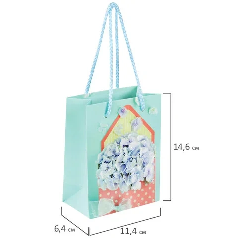 Изготовлен из ламинированного мелованного картона с веревочными ручками из полипропилена. Размер - 11,4x6,4x14,6 см. Пакет выполнен в светлых тонах с изображением летних цветов. С лицевой стороны пакета некоторые детали покрыты глиттером.