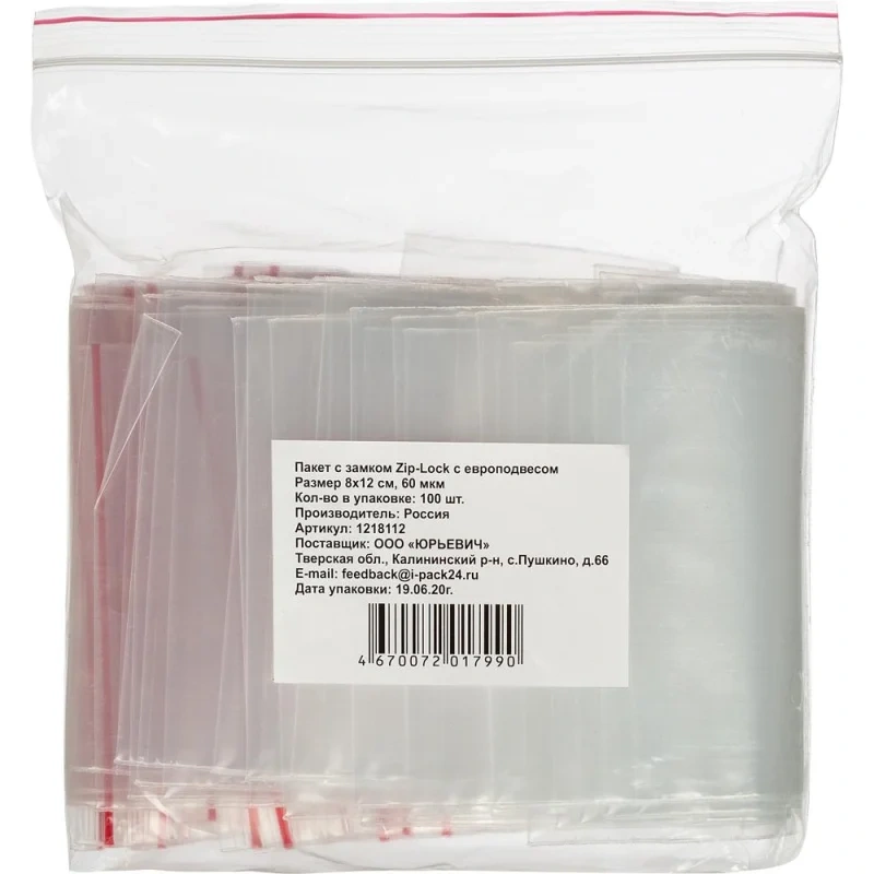 Пакет с замком (Zip Lock) с европодвесом 8х12 см, 60 мкм, 100 шт/уп