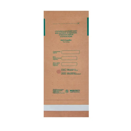 Самоклеющиеся пакеты из крафтовой бумаги для паровой, воздушной, этиленоксидной стерилизации изготовлены из крафт-бумаги с тремя клеевыми швами. Крафт-пакеты предназначены для стерилизации инструмента водяным паром, сухим горячим воздухом, оксидом этилена. Пакеты обеспечивают надежный 'микробный барьер' при герметизации с помощью самоклеющейся ленты на клапане в одинарной упаковке – 60 дней.