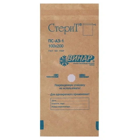 Пакеты для стерилизации Винар Стерит 200х100мм, крафт, самоклеящиеся, 100шт/уп