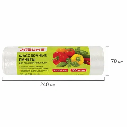 Обладают высокой эластичностью, сохраняют свежесть продуктов, предохраняют содержимое от посторонних запахов. Прозрачные фасовочные пакеты размером 24х37 см и плотностью 8 мкм изготовлены из экологически чистого ПНД (полиэтилена низкого давления). Поставляются в рулоне с втулкой, количество – 500 штук.