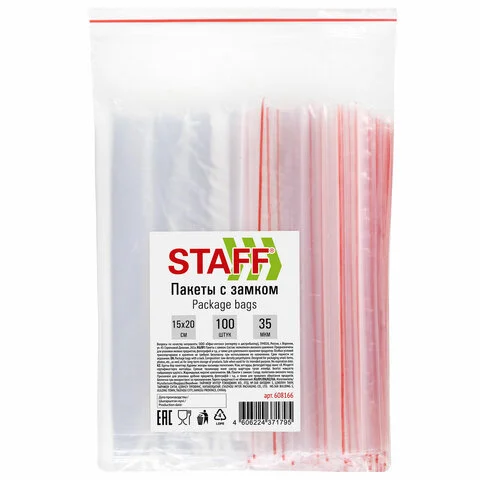 Пакеты с замком Zip Lock Staff 15х20см, 35мкм, ПВД, 100шт/уп