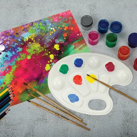 Палитра предназначена для смешивания красок. Удобна и проста в использовании. Позволяет получать новые оттенки путем смешивания цветов. По краю палитры есть 6 ячеек для размещения красок, а в центре палитры 4 отделения для смешивания.