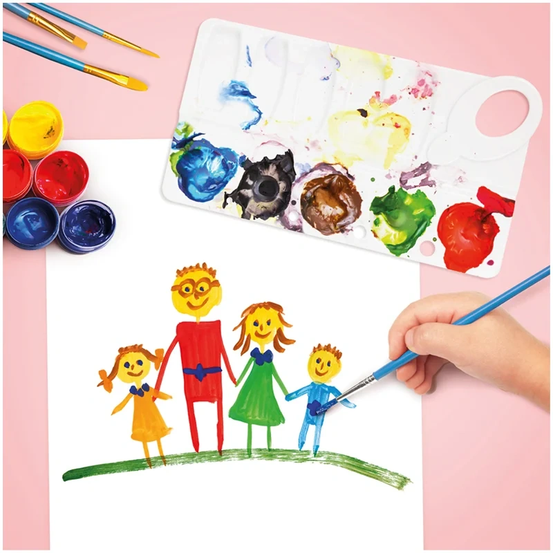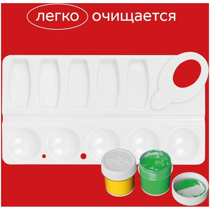 Прямоугольная палитра для рисования ГАММА – отличный инструмент для смешивания красок и получения новых тонов при создании рисунка. Она представлена в размере 20,5*11 см и имеет 10 ячеек. Художественная палитра изготовлена из пластика, у неё безупречно гладкая поверхность белого цвета. Она легко отмывается после использования. С помощью палитры дети учатся смешивать цвета и развивать цветовосприятие.