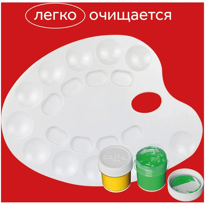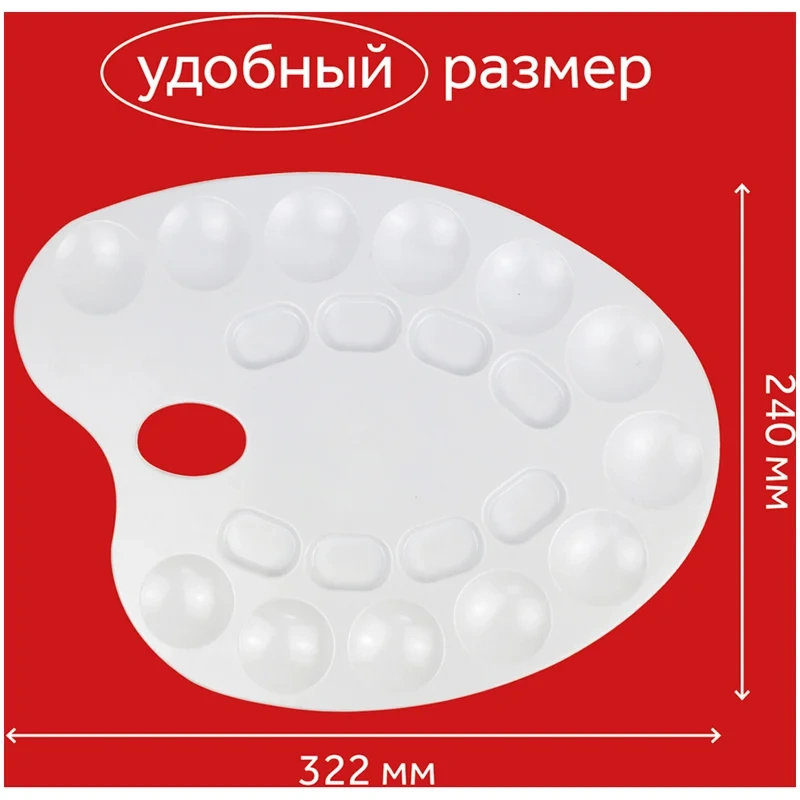 Средняя овальная палитра для рисования ГАММА – отличный инструмент для смешивания красок и получения новых тонов при создании рисунка. Она представлена в размере 24*32,2 см и имеет 20 ячеек. Художественная палитра изготовлена из пластика, у неё безупречно гладкая поверхность белого цвета. Она легко отмывается после использования. С помощью палитры дети учатся смешивать цвета и развивать цветовосприятие.
