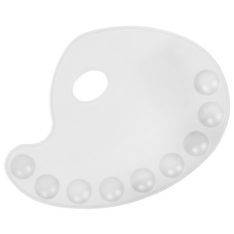 Легкая и компактная пластиковая палитра подходит для работы со всеми типами художественных красок: масляными, акриловыми, темперными, гуашевыми, акварельными. Имеет 9 ячеек для смешивания красок. Палитру овальной формы удобно держать в руке. Размеры - 28х21 см.