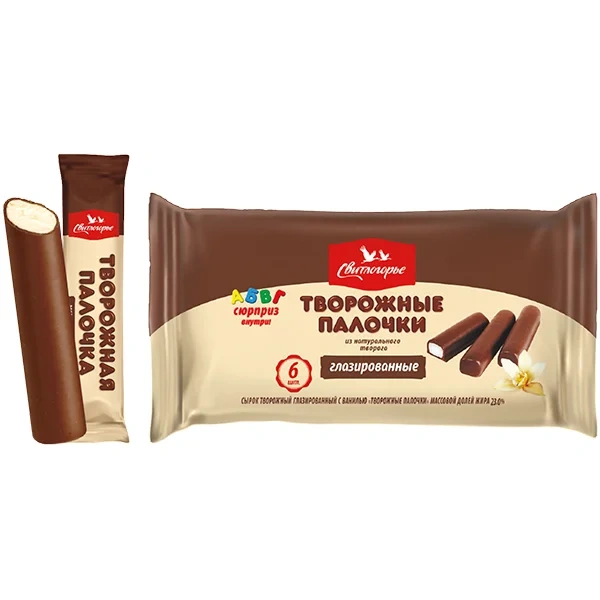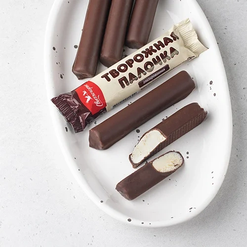В основе рецептуры – натуральный творог, изготовленный из свежего коровьего молока. К творожной массе добавляют сахар, сливочное масло и ваниль, тщательно вымешивают и формируют небольшие палочки. На следующем этапе десерты покрывают традиционной шоколадной глазурью, которая буквально тает во рту. Продукт станет прекрасным дополнением к завтраку и послужит отличным решением для перекуса в любое время дня. Каждый десерт имеет индивидуальную упаковку (всего их 6).
