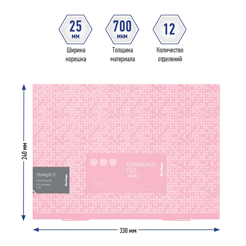 Стильная папка-картотека Berlingo серии Starlight S на 12 отделений формата А4 позволит удобно сортировать документы. Вмещает до 300 листов. Ширина корешка – 25 мм. Изготовлена из плотного высококачественного полипропилена толщиной 700 мкм с матовой текстурой поверхности 'песок', на которой не видно отпечатков пальцев и мелких царапин. Необычный дизайн: розовая обложка с рисунком. Каждое отделение папки с индексным полем, позволяет сортировать документы по темам или алфавиту. В комплект входят бумажные индексы с английскими буквами с одной стороны и пустые с оборотной, предназначенные для заполнения. Также есть резинка для надёжной фиксации. Размер папки составляет 330*240*25 мм. Упакована в индивидуальный пакет. • Вместимость, в листах: 300;• Формат: А4;• Цвет: розовый;• Ширина корешка: 25 мм